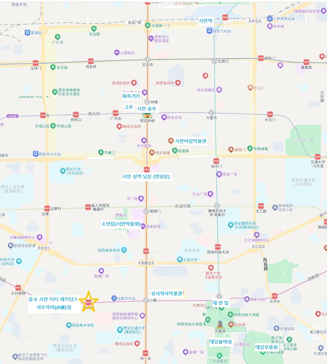 저희 티티 레지던스 호텔 샤오자이(小寨)점에서 걸어서 4분 거리에 바로 지하철역(吉祥村)이 있고 소안탑(시안박물원)과 섬서역사박물관이랑은 각각 3km 거리에 있습니다. 대안탑은 지하철로 2개 역 거리, 시안성벽의 정문인 영녕문은 지하철로 4개 역 거리, 종루와 고루 및 회족거리는 5개 역 거리에 인접해 있으며 시안역(西安站)과는 8개 역 거리에 있습니다.