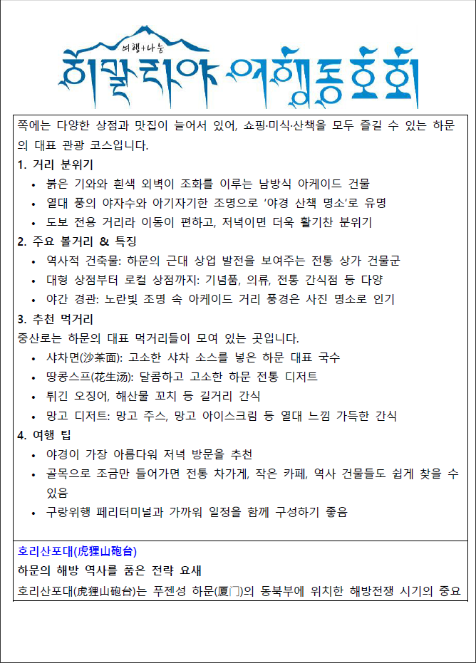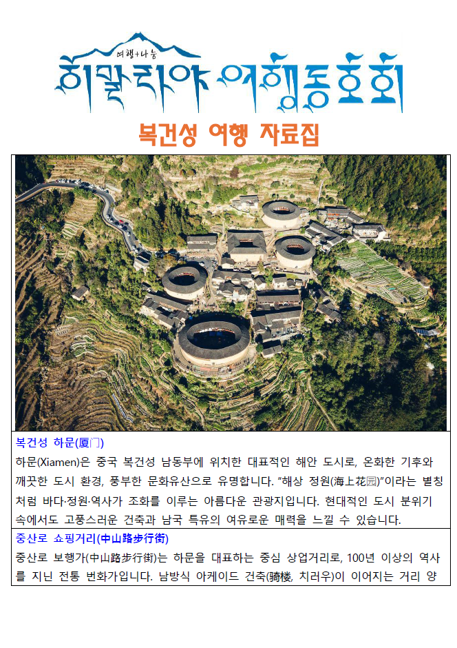 | 안녕하세요, 여행자 여러분. 이번 12월 복건성(福建省) 여행 자료집은 보다 알찬 여행 준비를 위해 정성껏 구성한 내부용 자료입니다. 자료집은 여행 신청자에게만 배포되는 전용 자료로, 외부 공유·전달·전재 등은 엄격히 금지됩니다. (인터넷 업로드, SNS 공유, 카페·단체방 재배포 등 포함) 여러분의 안전하고 즐거운 여행 준비를 위해 제작된 만큼 소중히 보관해 주시길 부탁드립니다. 📘 자료집 제공 시점 출발 전 개별 안내드릴 예정입니다. |
