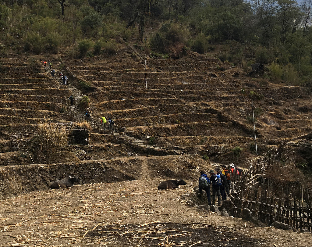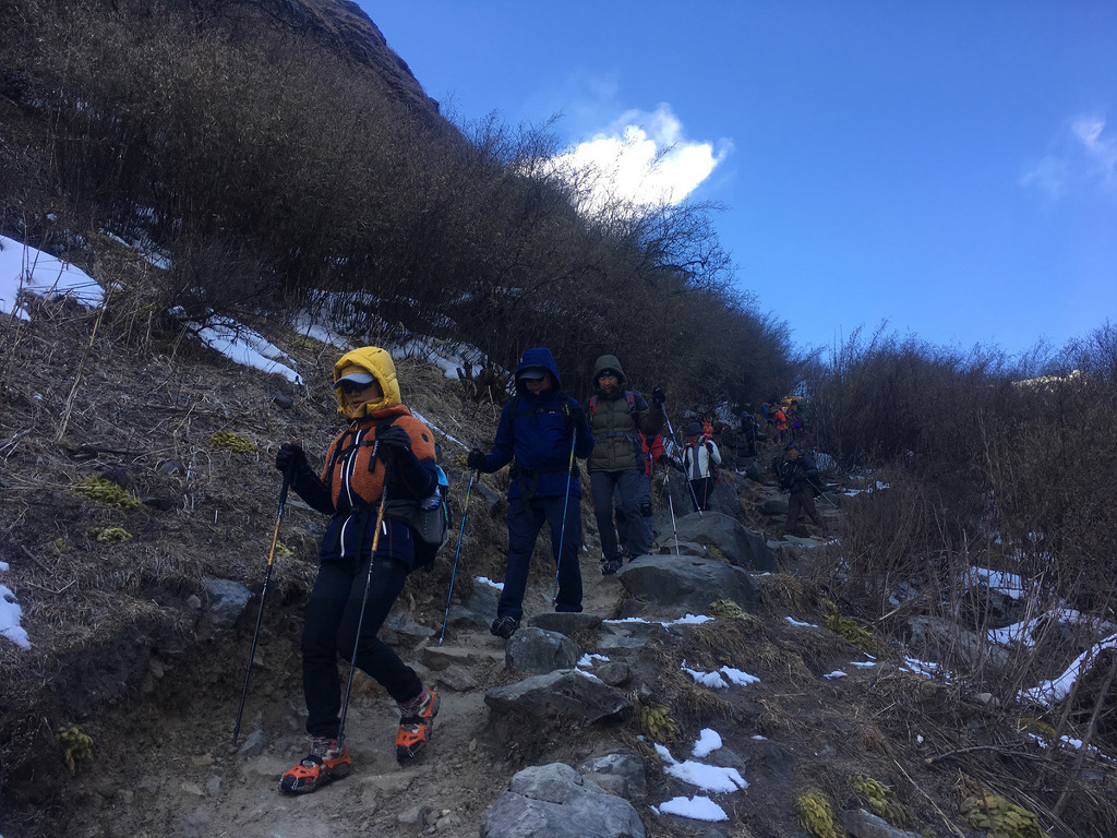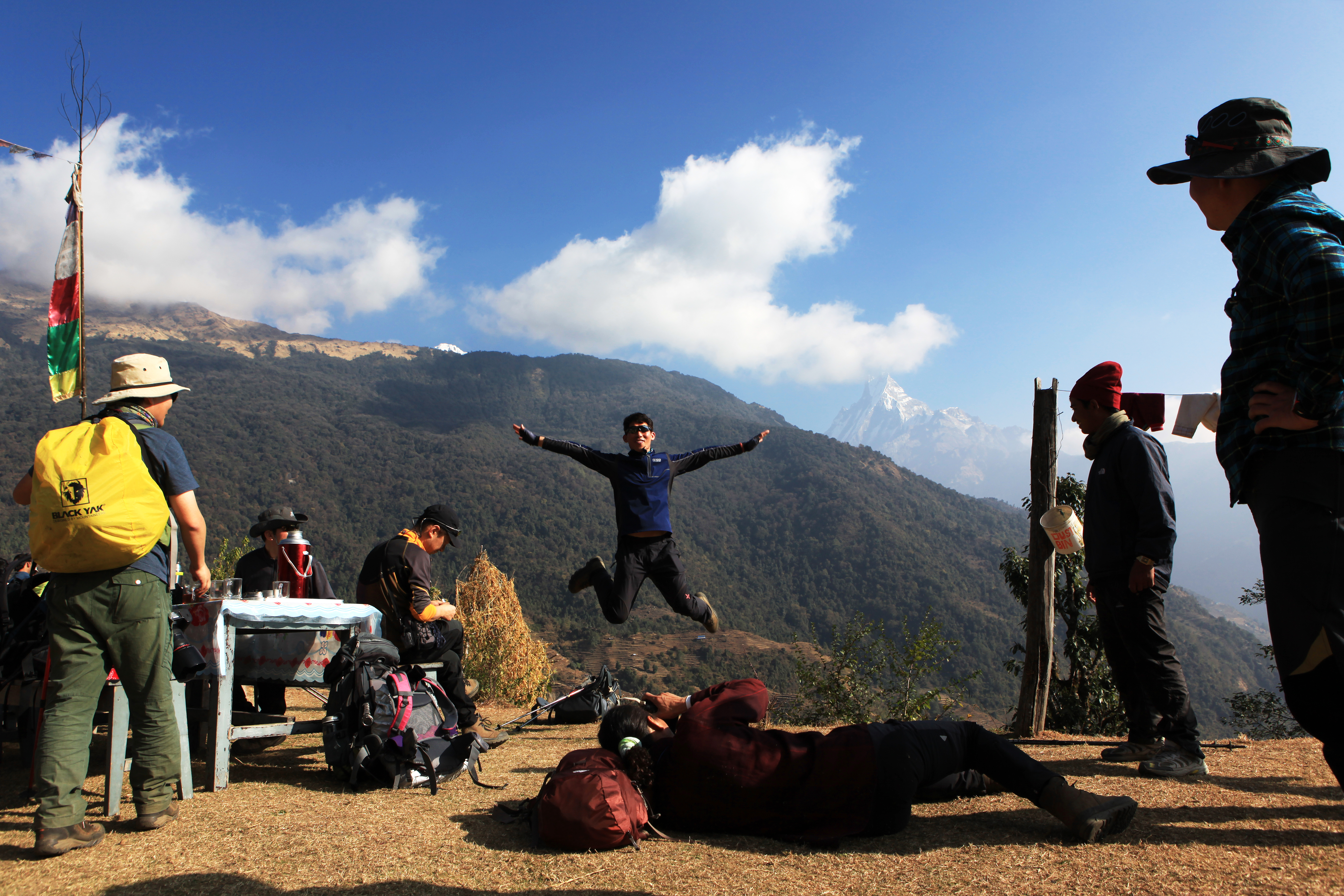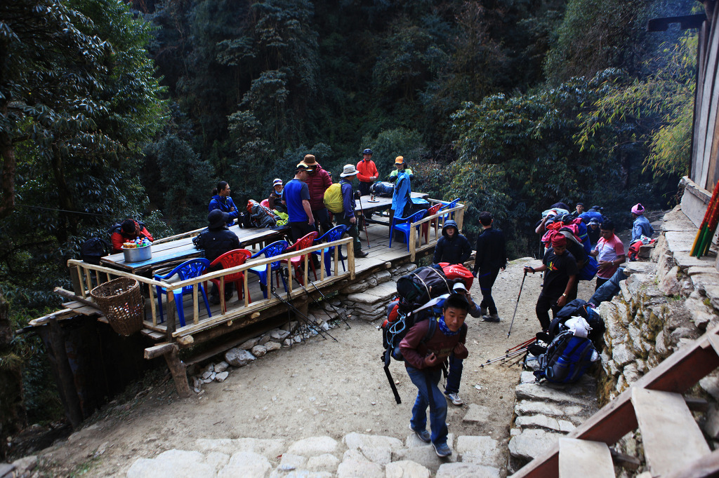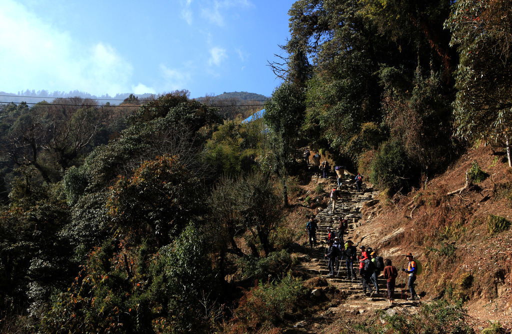 | -조식 후 -뱀부(Bamboo, 2,310m)-시누와(Sinuwa, 2,360m)-촘롱(Chomrong, 2,170m)-지누단다(Jhinu Danda, 1,780m) ▶촘롱에서 지누단다까지 가파른 내리막 길 ▶지누단다에서 노천 온천을 즐길 수 있습니다.(비용 1인/50루피) -트레킹 약 6시간 소요 -지누단다에서 스탭들과 마지막 밤을 지내며 파티 진행~ -투숙 및 휴식 |