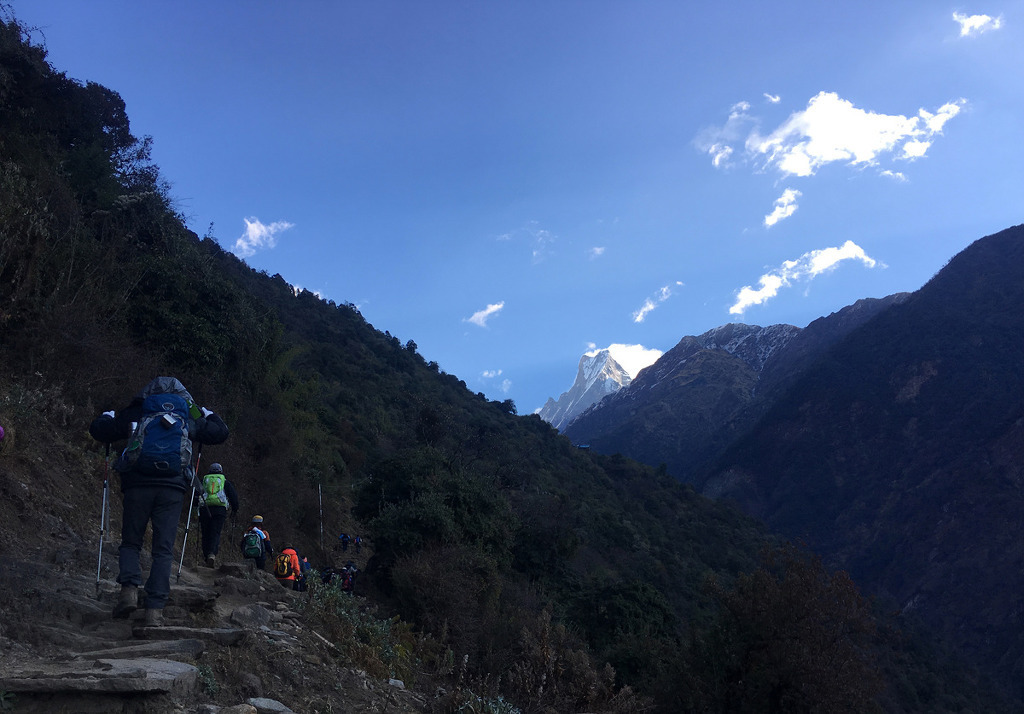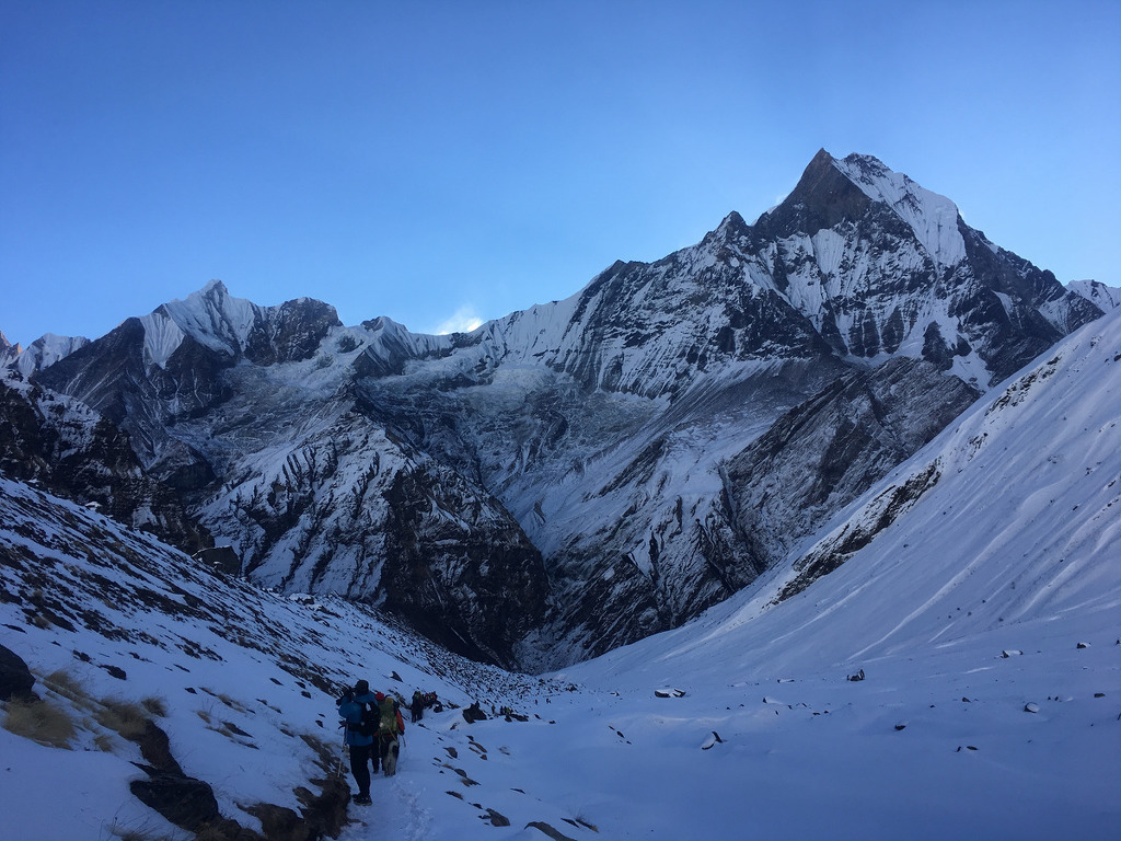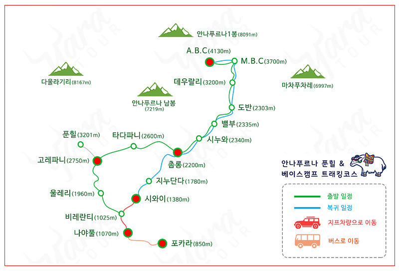 | -조식 후 -데우랄리(Deurali, 3,200m)-M.B.C(Machhapuchhare Base Camp, 3,700m)-A.B.C(Annapuruna Base Camp, 4,130m) ▶오르막 길을 따라 몇개의 작은 고개를 넘음 ▶안나푸르나 연봉, 마차푸차레, 히운출리, 팡...등 웅장하고 아름다운 히말라야 고산연봉 조망 -트레킹 약 6시간 소요 -투숙 및 휴식 |