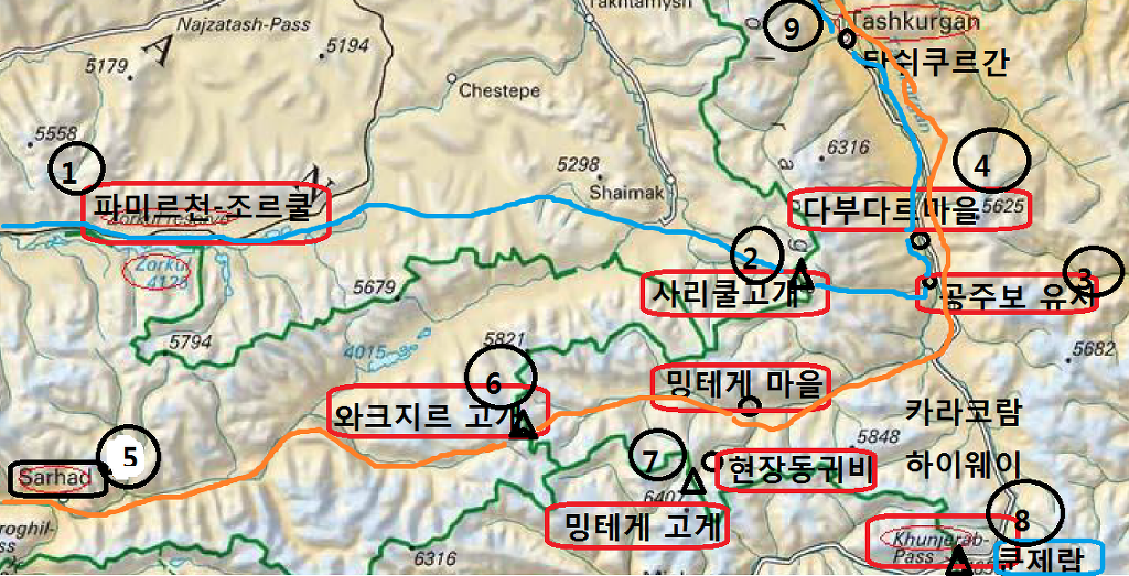 ▼ '와칸남, 북로'의 행선도와 타쉬쿠르간 인근의 역사 유적 분포도