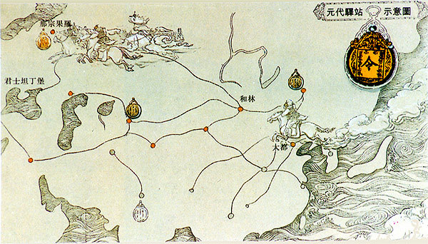 이 역참은 평균적으로 대개 말과 낙타의 하루 행군거리에 해당되는 40km5)마다 설치되었는데, 이용자는 일반적으로 3일간 무료로 편의를 제공받을 수 있었다. 물론 이 때 국가가 발행하는 일정한 허가증[첩지]이나 패자(牌子)-우리나라 식으로 한다면 말이 그려진 ‘마패(馬牌)’-등이 필요하였고 기타의 경우, 즉 대상들이나 개인적인 여행자는 공인된 화폐나 응분의 현물을 지불하는 방식도 함께 혼용되었을 것이다.