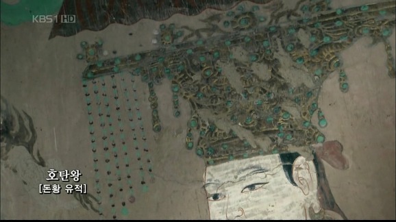 ▼ 온갖 보석류로 장식을 한 호탄왕의 위풍당당한 모습, 그런데, 송운의 묘사대로 “ 닭 벼슬과 같은 금관을 쓰고 있는데 머리 뒤로 길이 두 자, 폭 다섯 치의 비단을 늘어뜨려 장식하였다.” 같은 모습이다.