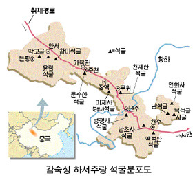 4) 하서주랑은 동쪽은 오초령(烏鞘嶺)으로부터 시작해 서쪽은 옥문관(玉門關)에 이르며, 남북은 남산(南山: 기련산(祁連山)과 아미금산(阿爾金山))과 북산(北山: 마종산(馬鬃山), 합려산(合黎山) 및 용수산(龍首山)) 사이의 길이 약 900km, 폭 수km에서 100km에 이르는, 서북-동남 방향으로 늘어선 좁고 긴 평지이다. 감숙성(甘肅省)의 난주(蘭州)와 「하서사군(河西四郡): 무위(武威), 장액(張掖), 주천(酒泉), 돈황(敦煌)」을 포괄한다. 거주하는 민족은 한족과 몽골족, 위구르족, 티베트족 등의 민족이 있다. 한의 무제가 하서를 개벽해 무위, 장액, 주천, 돈황의 사군을 연 이래, 내륙의 신강(新疆)으로 이어지는 중요한 통로이며, 고대 실크로드의 일부분으로서 고대 중국과 서방 세계의 정치·경제·문화적 교류를 진행시킨 중요한 국제 통로였다. 복도 모양과 같고 황하의 서쪽에 있어 하서주랑이라 부른다.
