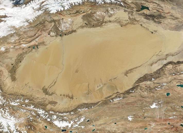 1) 타클라마간(塔克拉玛干)은 신장위구르자치구에 있는 사막으로 남쪽으로는 곤륜산맥, 남서쪽으로는 파미르 고원, 서쪽과 북쪽으로는 천산산맥에 의해 경계가 정해진다. 그 면적은 270,000km²에 달하며 길이는 1,000km, 폭은 400km이다. 북부와 남부 가장자리에 비단길이 있으며 근래에는 중국이 타림사막 고속도로를 건설하였는데 남쪽의 호탄과 북쪽의 룬타이를 연결하였다.