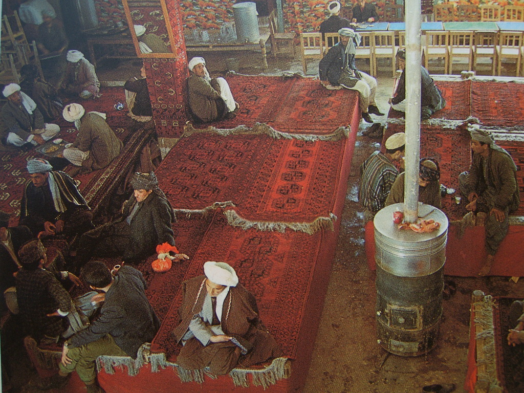 한편 건물 안으로 들어가면 대청 중앙에는 따듯한 난로 위에 차 항아리가 항상 얹어 있을 것이니, 우선 차이[茶]로써 목을 축이고 난 다음 일반적인 메뉴4)인 양고기 스프인 ‘슈르빠’와 주식인 빵‘논[난]’그리고 야채와 고기가 섞인 기름으로 볶은 밥인‘오쉬[쁠로프]’그리고 고기국수인‘라그만’중에서 한 두가지를 주문한다.
