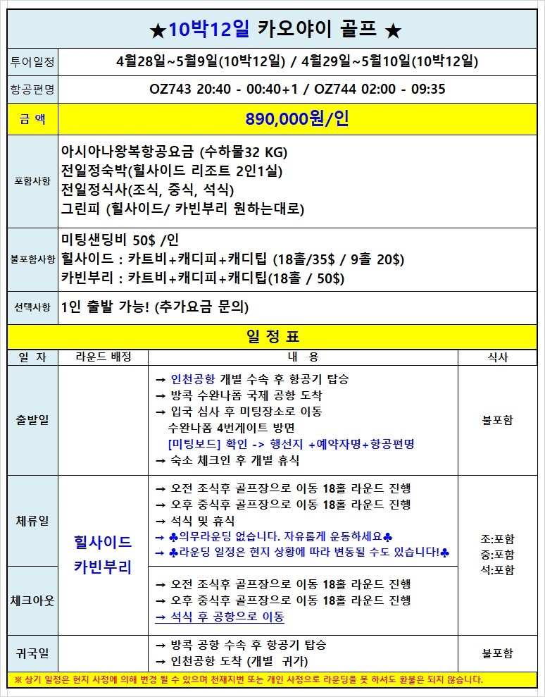✈[항공포함][태국골프][10박12일][890,000원][아시아나항공]