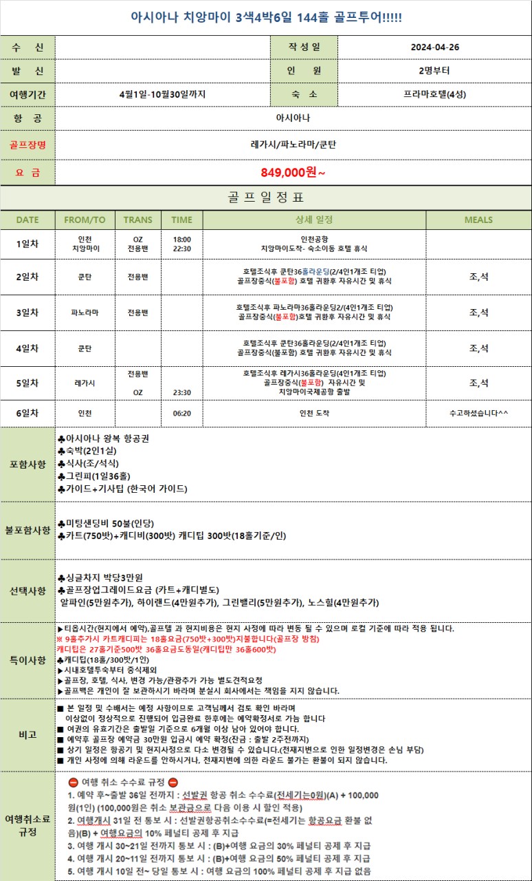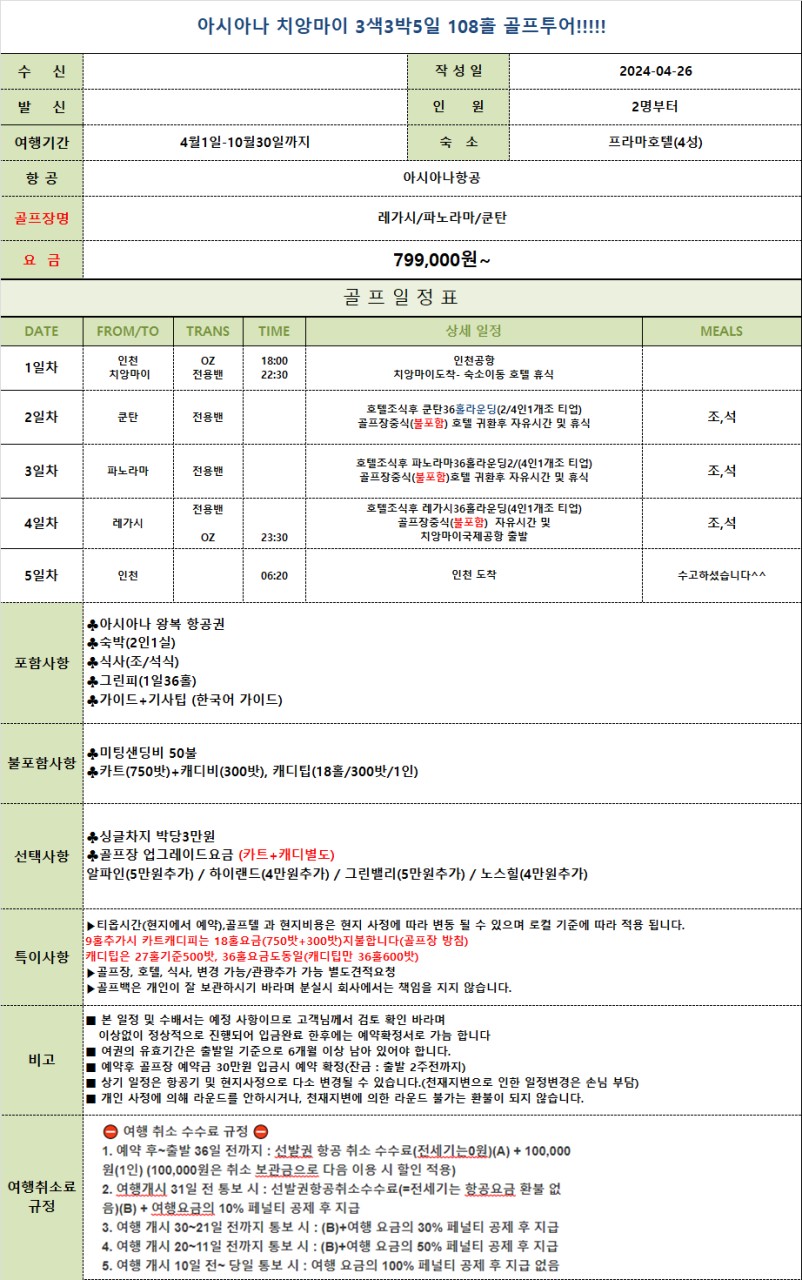 작성자이상호작성시간24.04.29조회수449 목록 댓글 0✈[아시아나항공포함][태국치앙마이골프][대박특가][3박5일][4박6일]