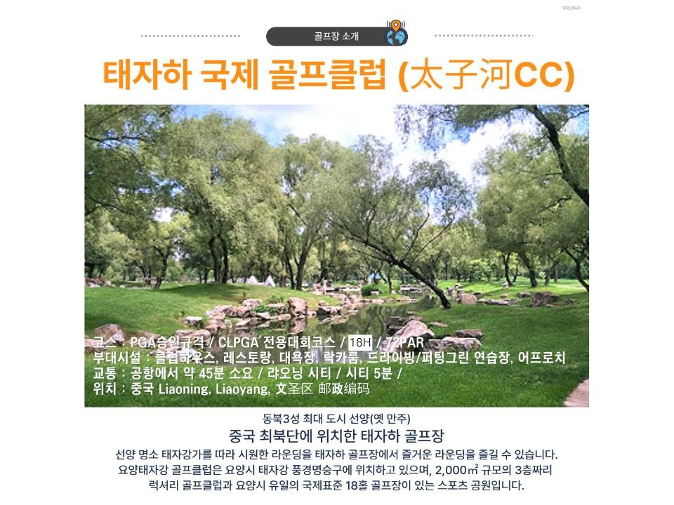 심양의 명소 태자강가를 따라 고수부지 내에 만들어진 중상급의 골프장으로 강변 바람과 많은 고목들이 있어 시원한 라운딩을 즐길수 있는 것이 특징이다. 요양 태자하 골프클럽은 요양시 태자강 풍경명승구에 위치하고 있으며 3층 규모의 럭셔리한 클럽하우스와 요양시 유일의 국제표준 18홀 골프장이 있는 스포츠 공원입니다.