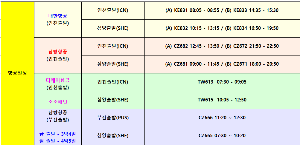 심양출발 A(CZ681) 09:00~11:45) / B(CZ671) 18:00~20:30 매일 2회