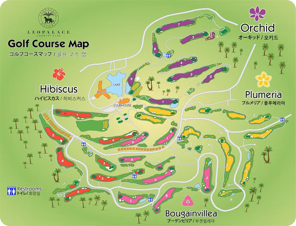 괌 레오팔래스CC는 하이비스커스 코스 9홀, 오키드 코스 9홀, 부겐빌리야 코스 9홀, 플루메리아 코스 9홀, 총 36홀 규모로 전설적인 골프 선수인 Jack Nicklaus와 Arnold Palmer가 코스 디자인을 맡았습니다.