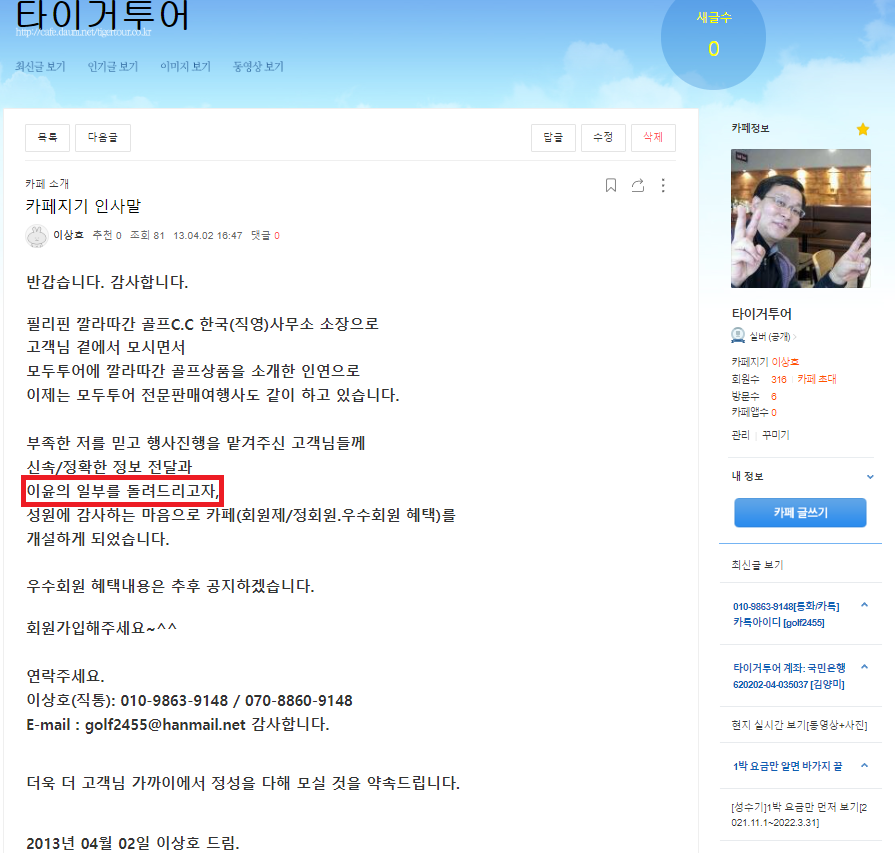 타이거투어 단골 고객님께만 드리는 카톡입니다.