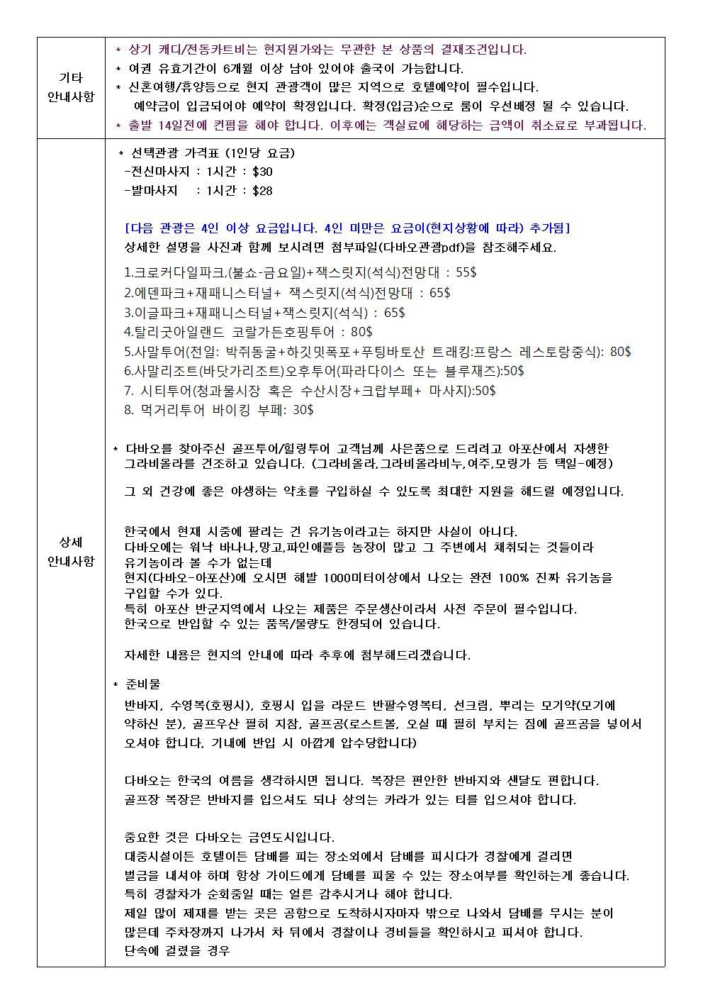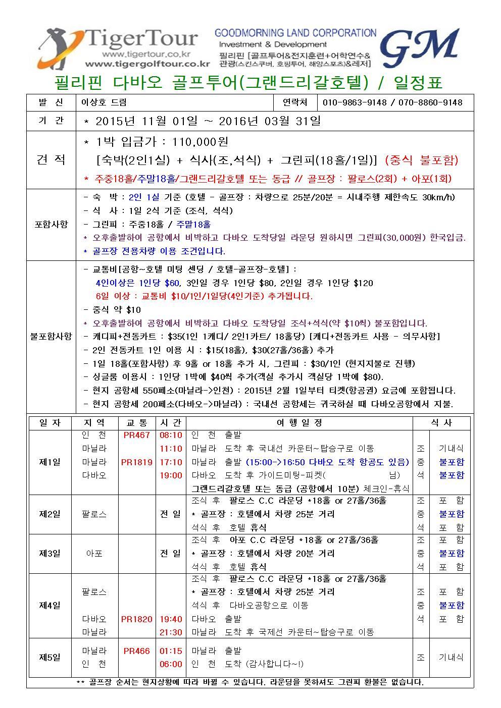 그랜드리갈호텔을 숙소로 다바오 골프투어 일정표입니다.