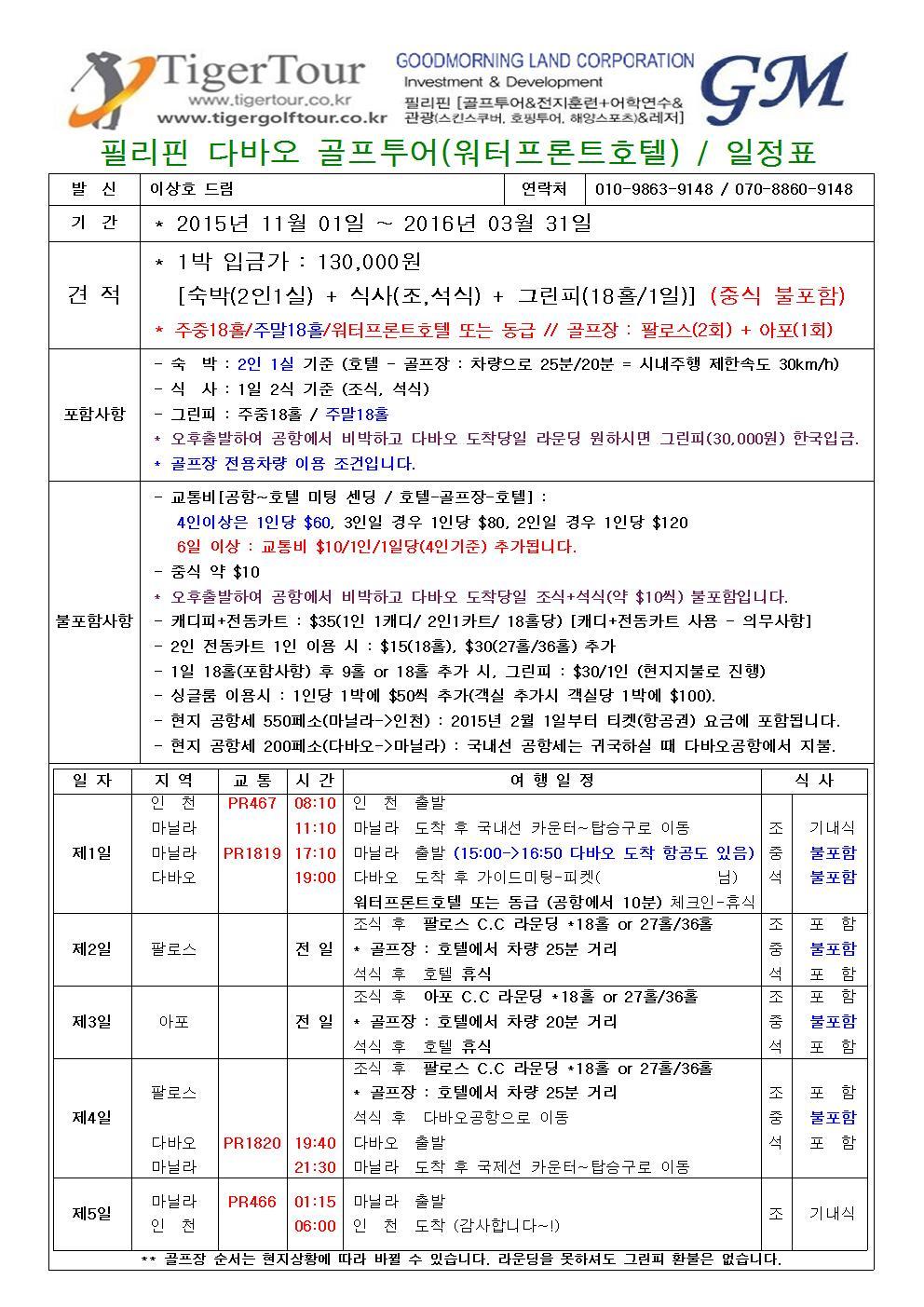 워터프론트호텔을 숙소로 다바오 골프투어 일정표입니다.