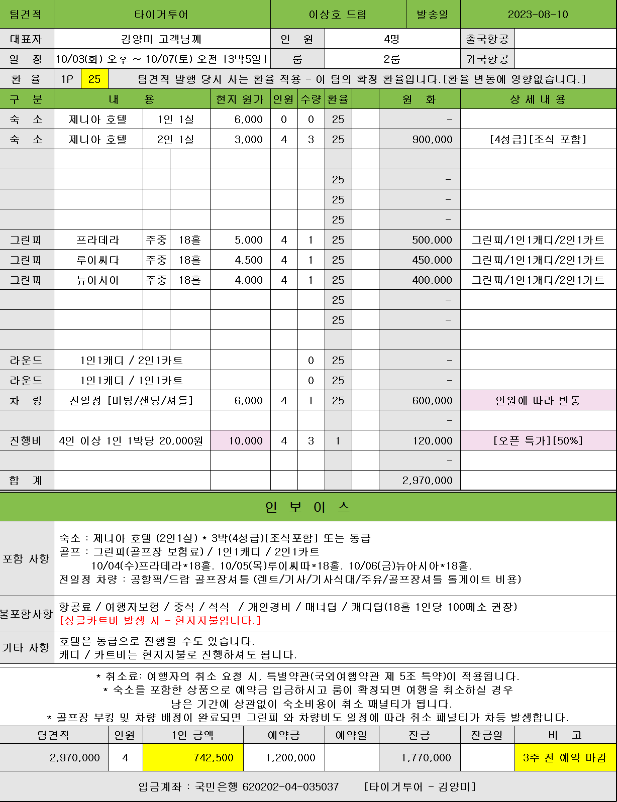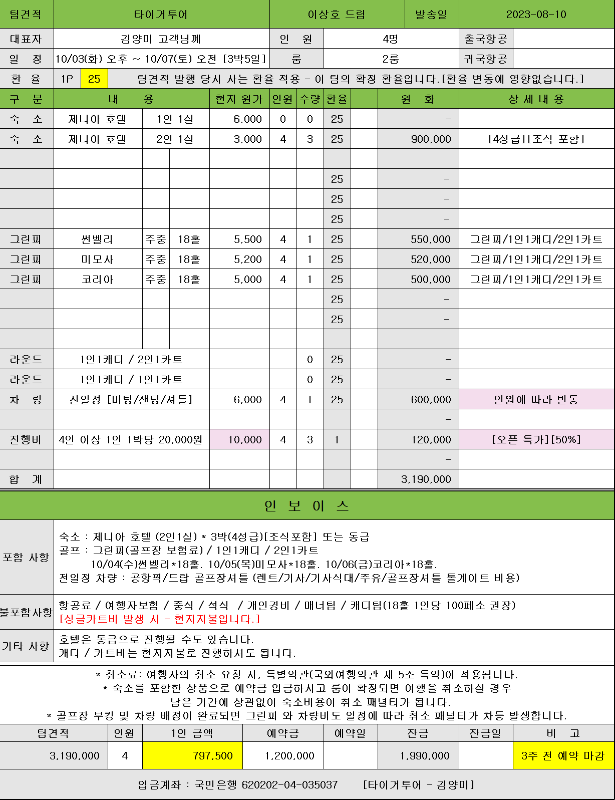 타이거투어에서 1박요금으로 바가지 없는 요금제를 15년 동안 시행하고 있습니다.