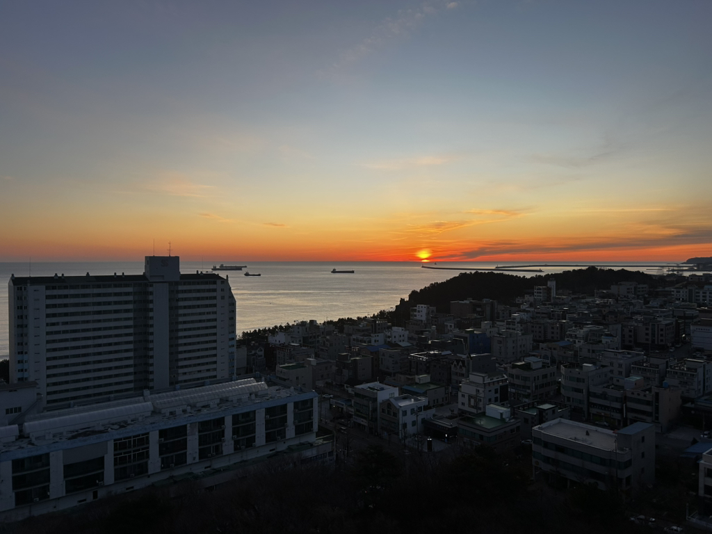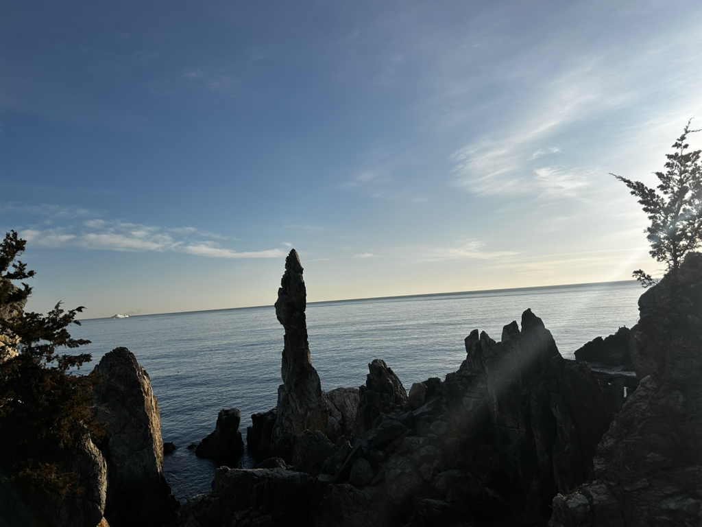 촛대바위 너머 동해에서 붉게 떠올라 서산으로 기우는 햇길을 따르기 위해 금요일 늦은 오후, 동해로 달렸다. 해가 떠서 지는 거리인지라 참 멀다. 저녁 늦게 도착해 ‘담다’라는 한정식 밥집에서 강원도 음식 맛을 입안에 가득 들였다. 2일간 머무를 호텔은 ‘동해현진관광호텔’로, 3성 호텔로 자랑할 만큼 불편함은 없었다. 객실에서 볼 수 있는 동해바다 뷰가 너무 좋았고, 다음 날 새벽 해돋이도 볼 수 있었다.