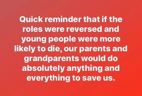 "만약 코로나가 노인들이 아닌 젊은 사람들에게서 사망률이 더 높았다면, 우리 부모님과 조부모님은 어떤 것이든 해서라도 우리를 지키려 하셨을 것이다."