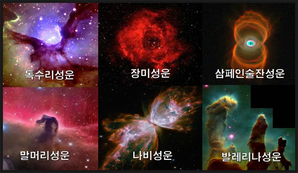 장미꽃처럼 생겼다고 해서 장미성운, 샴페인 술잔성운, 비둘기성운, 말머리성운, 독수리성운, 나비성운, 햄버거성운, 발레리나성운, 기둥을 세워 놓은 것 같은 기둥성운도 있다. 사람은 광대한 우주의 별들의 숫자를 다 알 수 없다. 그러나 하나님은 천지를 창조하신 분이시기 때문에 하늘의 모든 별들의 수효를 다 알고 계신다. 하나님의 광대하신 능력과 지혜는 무궁하다.