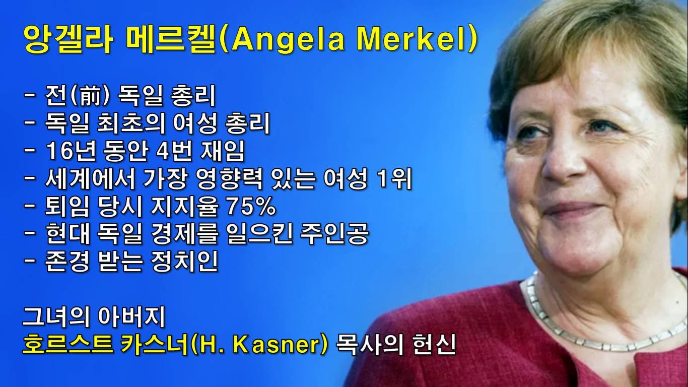 독일 최초의 여성 총리로서 16년 동안 4번이나 재임했고(2005.11.22-2021.12.7), 재임기간에는 10년 연속 세계에서 가장 영향력 있는 여성 1위로 선정이 되었으며, 지금도 여전히 많은 사람들에게 존경받는 정치인이 있다. 바로 앙겔라 메르켈’(Angela Merkel) 전 독일 총리이다. 메르켈 전 총리의 리더십과 성품 그리고 그녀의 신앙은 여러 사람들이 연구하고 있다.