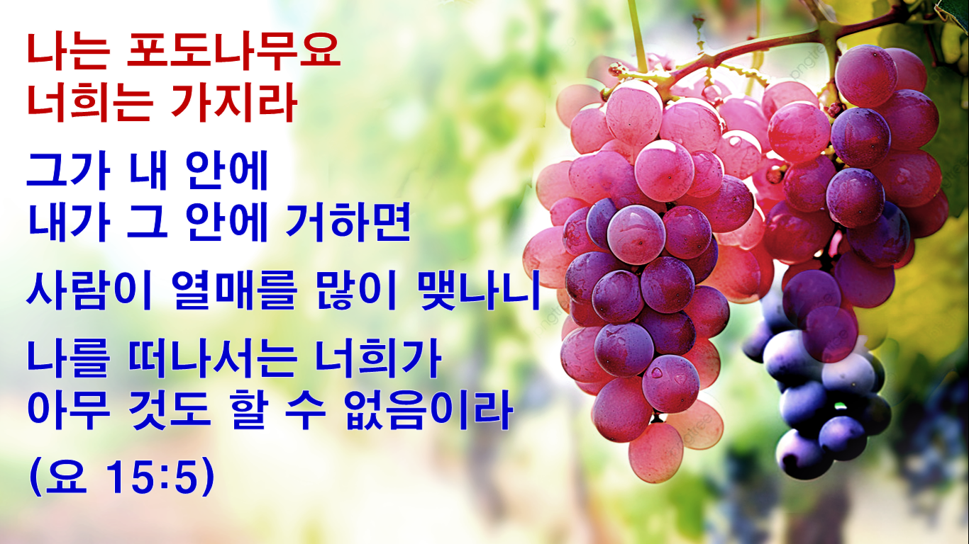 “나는 포도나무요 너희는 가지라 그가 내 안에, 내가 그 안에 거하면 사람이 열매를 많이 맺나니 나를 떠나서는 너희가 아무 것도 할 수 없음이라”(요 15:5)