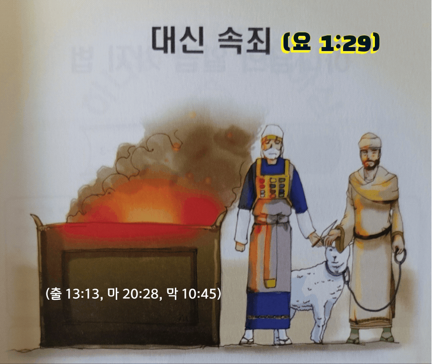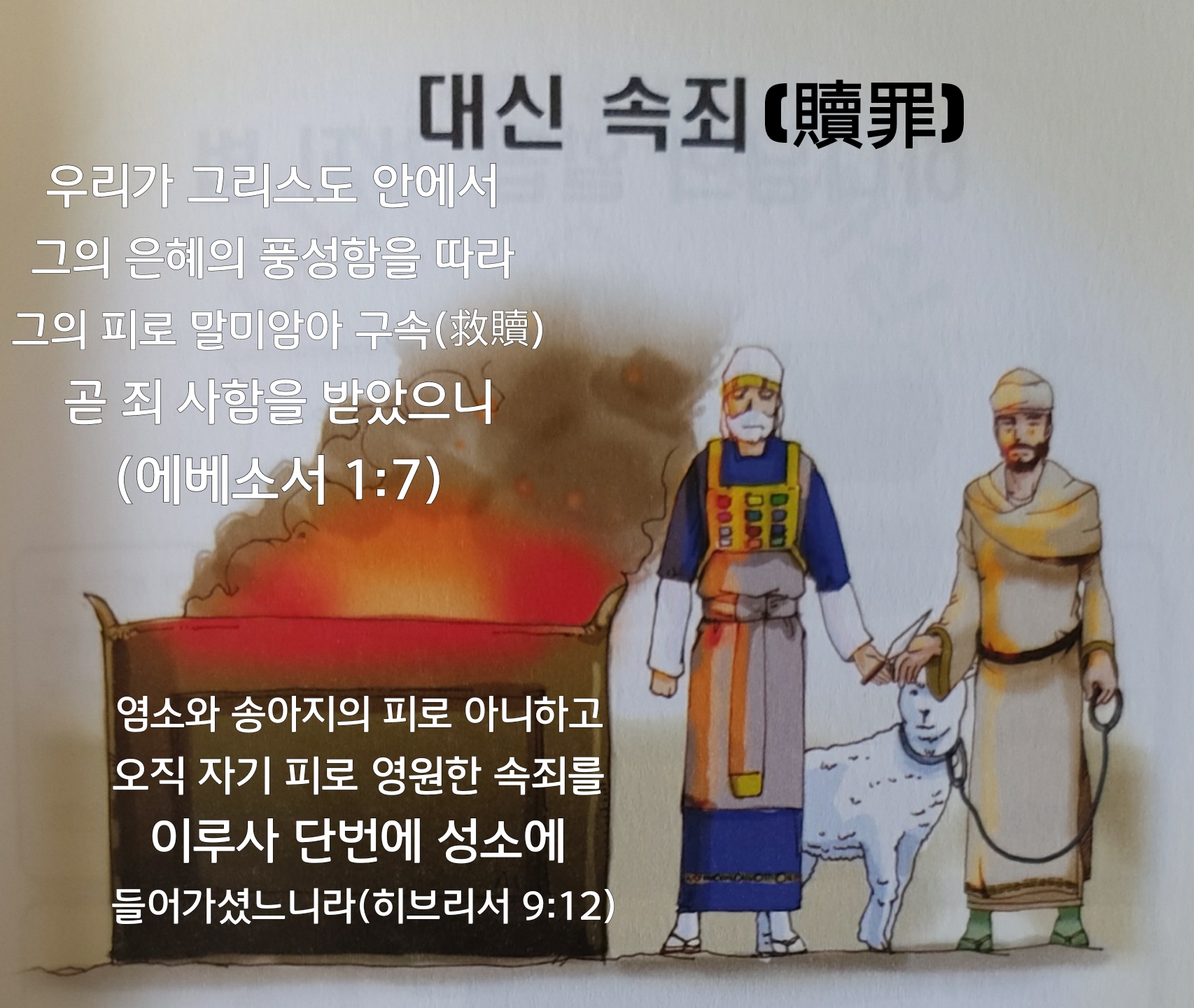 특별히 구약 성경에서 하나님은 이것을 시청각 교육으로 잘 보여 주셨다. 이스라엘 사람이 죄를 지으면 그는 소나 양 등의 짐승을 끌고 성막 앞의 제사장에게로 간다(레1:2-9). 그리고 그 짐승의 머리에 안수하여 자기의 죄를 짐승에게 전가시키고 칼로 직접 짐승의 목을 찌른다. 그가 칼을 양의 목에 꽃는 순간 양은 비명을 지르고 피가 몸에서 튀어 나온다. 이로써 죄인은 죄가 있으면 반드시 피를 흘리는 희생물이 있어야만 함을 뼈저리게 느낀다. 그런데 여기서 끝나지 않고 그는 이 제물을 여러 조각내서 번제 헌물 제단에 던져 태워야 한다.