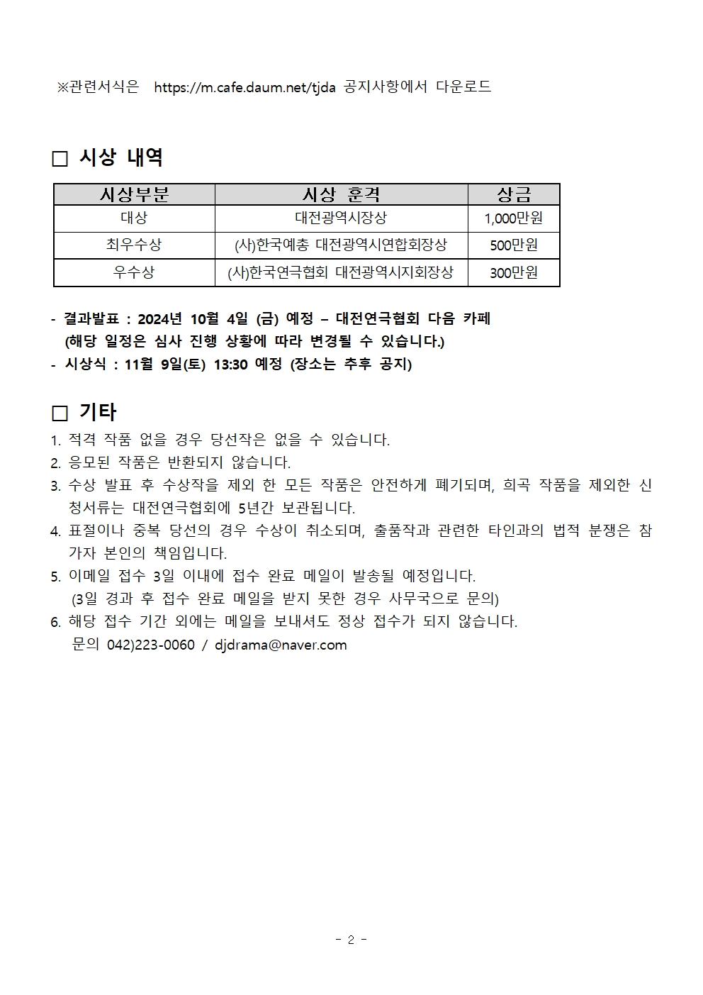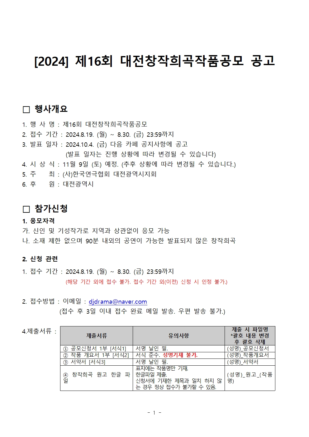 2024 제16회 대전창작희곡작품공모 공고 안내 작성자김석규|작성시간24.07.15|조회수953 목록 댓글 0 글자크기 작게가 글자크기 크게가 [공고]2024 제16회 대전희곡공모 공고.hwp60.50KB[서식]2024 제16회 대전희곡공모신청 서식.hwp39.00KB 첨부파일첨부된 파일이 4개 있습니다. jpg 파일 [공고]2024 제16회 대전희곡공모 공고002.jpg 다운로드 jpg 파일 [공고]2024 제16회 대전희곡공모 공고001.jpg 다운로드 hwp 파일 [공고]2024 제16회 대전희곡공모 공고.hwp 다운로드 hwp 파일 [서식]2024 제16회 대전희곡공모신청 서식.hwp 다운로드 다음검색 현재 게시글 추가 기능 열기 북마크 공유하기 신고 센터로 신고 댓글 댓글 0 댓글쓰기 답글쓰기 댓글 리스트