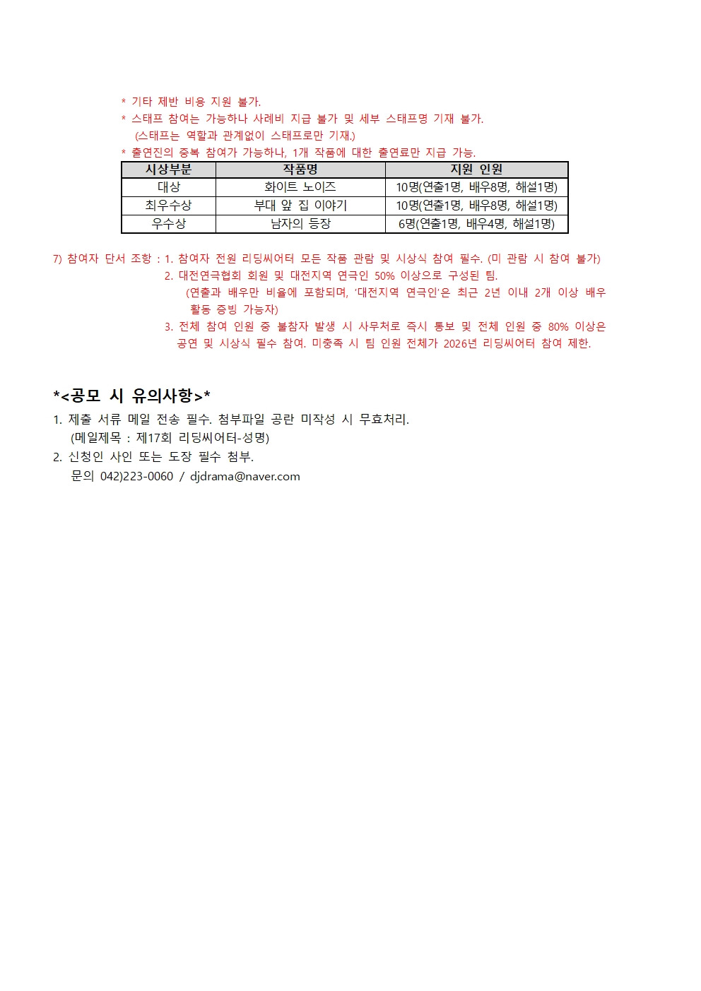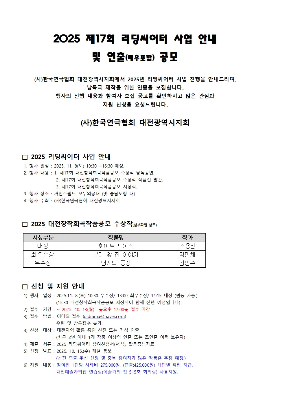 2025 제17회 리딩씨어터 연출(배우포함) 모집 공고 작성자김석규|작성시간25.10.02|조회수39 목록 댓글 0 글자크기 작게가 글자크기 크게가 2025 제17회 리딩씨어터 공고 및 서식.hwp68.00KB대상_화이트 노이즈_조용진.pdf176.92KB최우수상_부대 앞 집 이야기_김민채.pdf218.65KB우수상_남자의 등장_김민수.pdf194.68KB 첨부파일첨부된 파일이 6개 있습니다. jpg 파일 2025 제17회 리딩씨어터 공고 및 서식002.jpg 다운로드 jpg 파일 2025 제17회 리딩씨어터 공고 및 서식001.jpg 다운로드 hwp 파일 2025 제17회 리딩씨어터 공고 및 서식.hwp 다운로드 pdf 파일 대상_화이트 노이즈_조용진.pdf 다운로드 pdf 파일 최우수상_부대 앞 집 이야기_김민채.pdf 다운로드 pdf 파일 우수상_남자의 등장_김민수.pdf 다운로드 다음검색 현재 게시글 추가 기능 열기 북마크 공유하기 신고 센터로 신고 댓글 댓글 0 댓글쓰기 답글쓰기 댓글 리스트