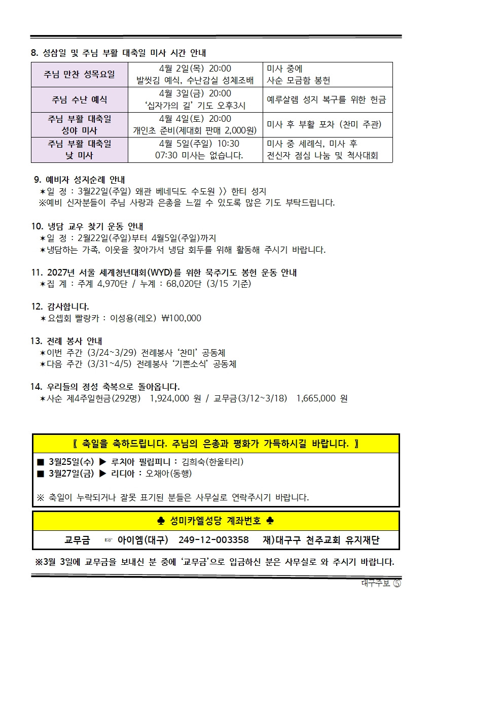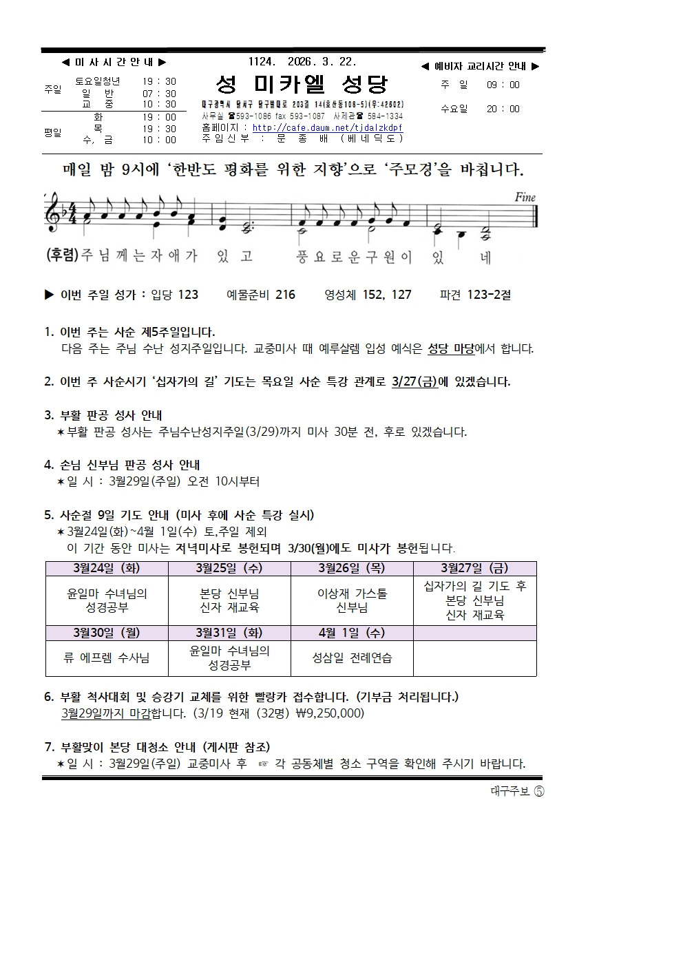 사순제5주일(2026년3월22일) 작성자사무실(허베로니카)|작성시간26.03.20|조회수128 목록 댓글 0 글자크기 작게가 글자크기 크게가 260322주보.hwp164.00KB 첨부파일첨부된 파일이 3개 있습니다. jpg 파일 260322주보001.jpg 다운로드 jpg 파일 260322주보002.jpg 다운로드 hwp 파일 260322주보.hwp 다운로드 다음검색 현재 게시글 추가 기능 열기 북마크 공유하기 신고 센터로 신고 댓글 댓글 0 댓글쓰기 답글쓰기 댓글 리스트