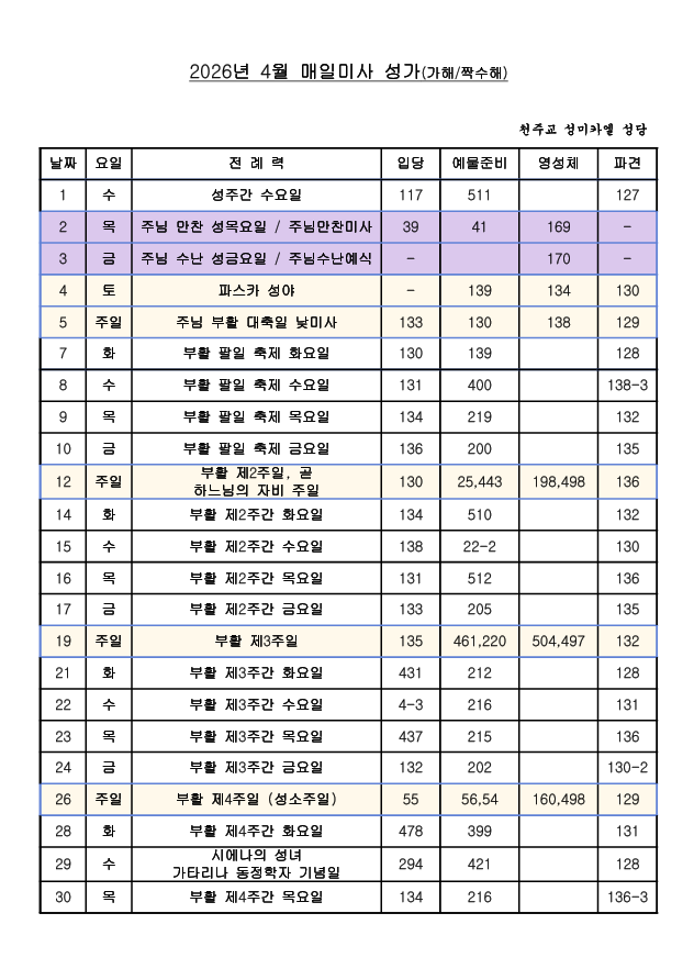 2026년 4월 성가표(가해) 작성자글라라|작성시간26.03.16|조회수20 목록 댓글 0 글자크기 작게가 글자크기 크게가 클라라_매일미사 성가번호 4월_2026.hwp58.50KB 첨부파일첨부된 파일이 2개 있습니다. png 파일 202604(가해)_성가표.png 다운로드 hwp 파일 클라라_매일미사 성가번호 4월_2026.hwp 다운로드 다음검색 현재 게시글 추가 기능 열기 북마크 공유하기 신고 센터로 신고 댓글 댓글 0 댓글쓰기 답글쓰기 댓글 리스트