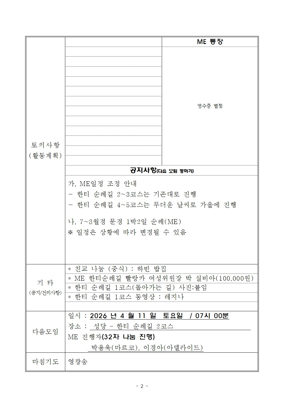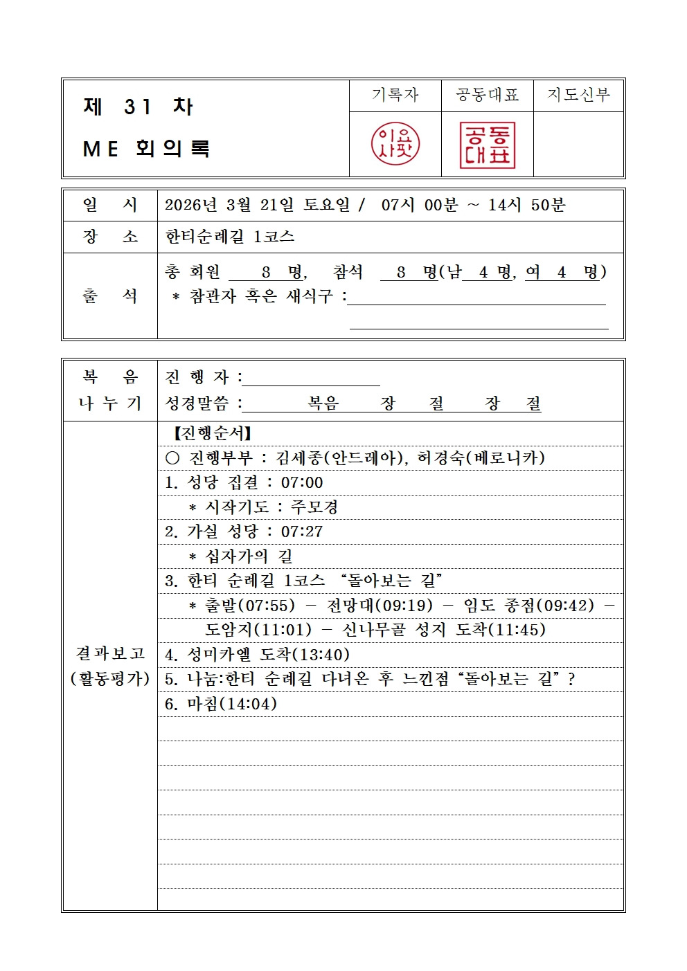 【제31차】ME 회의록 *한티 순례길 1코스* 작성자이동희(요사팟)|작성시간26.03.21|조회수32 목록 댓글 0 글자크기 작게가 글자크기 크게가 다음검색 현재 게시글 추가 기능 열기 북마크 공유하기 신고 센터로 신고 댓글 댓글 0 댓글쓰기 답글쓰기 댓글 리스트