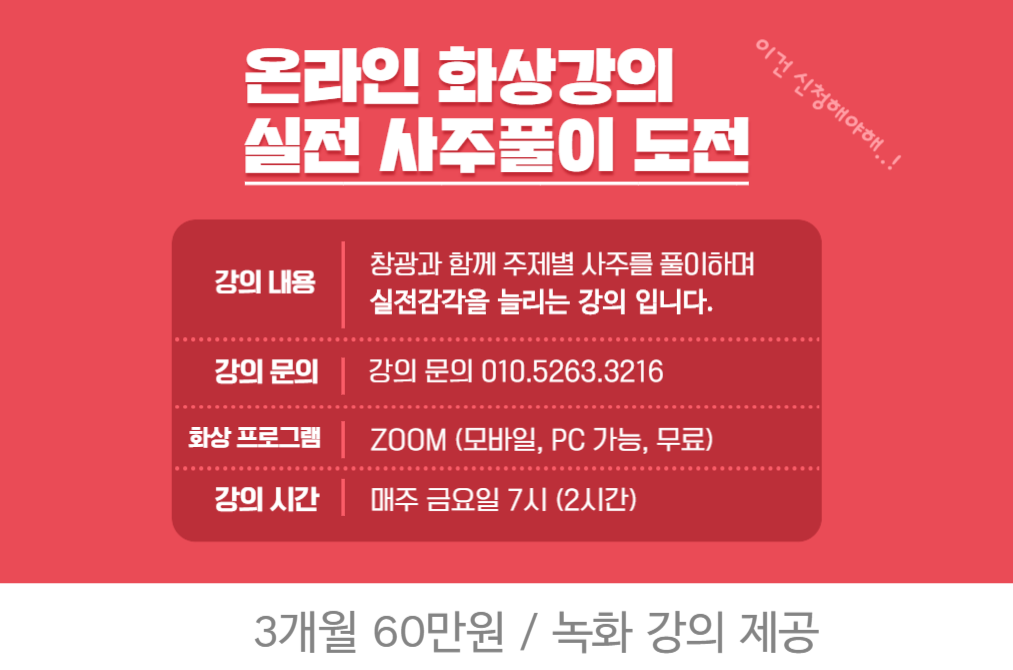 ▣ 온라인 화상 강의(실전 사주풀이 도전), 강사 : 창광 김성태 작성자더큼학당|작성시간19.08.06|조회수1,225 목록 댓글 1 글자크기 작게가 글자크기 크게가 ▣ 온라인 화상강의 (실전 사주풀이 도전) 다음검색 현재 게시글 추가 기능 열기 북마크 공유하기 신고 센터로 신고 댓글 댓글 1 댓글쓰기 답글쓰기 댓글 리스트 작성자박정호 | 작성시간 19.08.28 임상마스터 네요! 부럽부럽^^ 댓글 전체보기