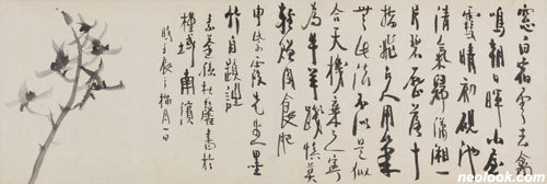 ● 소전은 당대 대표적 시인묵객들과 풍류를 즐긴 합작(合作)들을 많이 남겼는데, 경향간에 많은 문필가, 서화가들과의 교류는 물론 중국과 일본의 예술가들과 교류한 합작도 여러 점 발견된다. 소전은 당대 예술계의 최고 풍류묵객답게 벗들과 아회(雅會)를 즐겼다. 그 중 을유년 해방이 되던 해의 성북동 「승설암도(勝雪菴圖)」가 인상 깊다. 그것은 청명절 승설암에 모여 앉아 소설가 상허(尙虛)의 부탁으로 소전이 그리고 제를 쓴 즉석작품인데, 흙 담 아래 수석 분이 놓여 있는 정원을 내다보고 그린 작품이다.