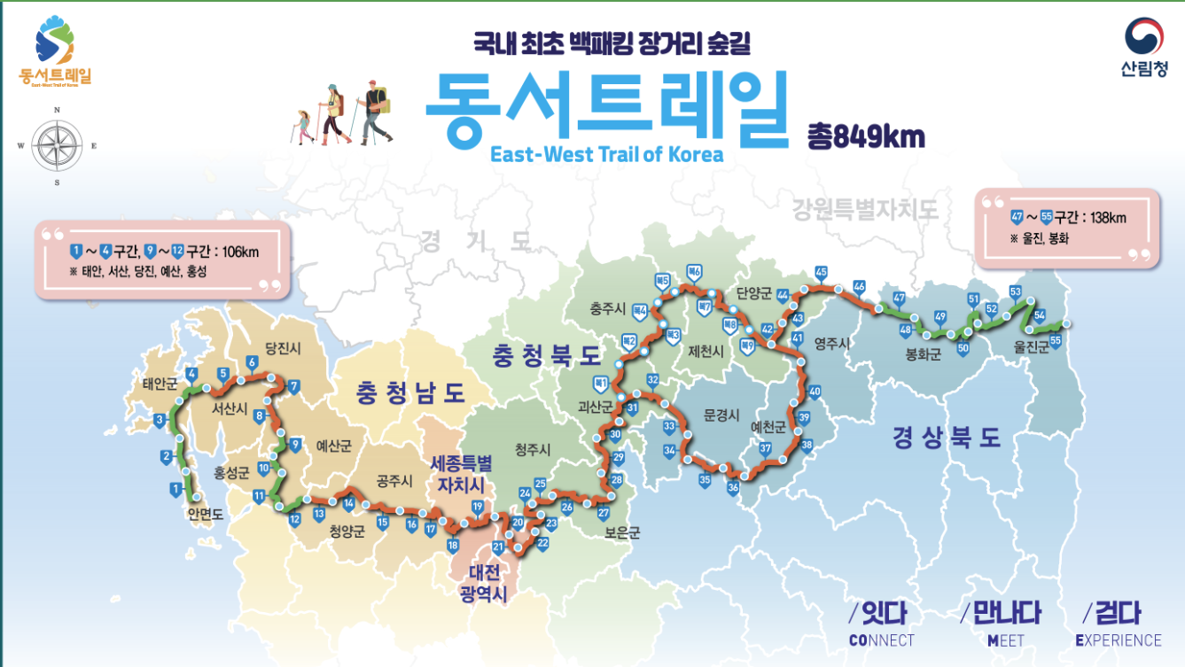 동서트레일은 서쪽 끝 태안 안면도에서 시작하여 내포문화숲길, 속리산 둘레길, 경북 북부의 깊은 오지를 지나 동쪽 끝 울진 망양정에 이르는 총 849km의 장거리 트레킹 코스입니다. 단순히 걷는 길을 넘어, 한반도의 남쪽 허리를 가로지르며 숨겨진 마을과 숲, 그리고 사라져가는 풍경을 두 발로 기록하는 역사적인 여정입니다.