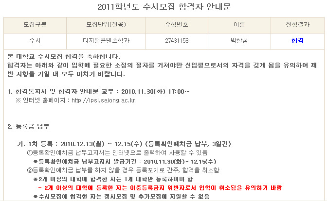 그런데 저번에 숭실대 전산오류나서 다 합격표시 떳다는 얘기가 있어서 세종대도 그런거아닌가 하면서 또 안믿겨가지고 언니한테 3번이나 더 전화해서 확인했어요.....