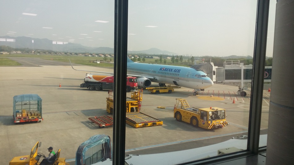 청주공항에서 저녁때 비행기를 탈려고 기다리고 있습니다...비행기는 앞에 있는 대한항공...