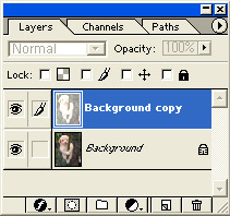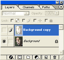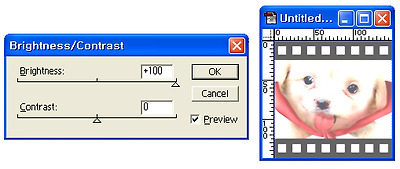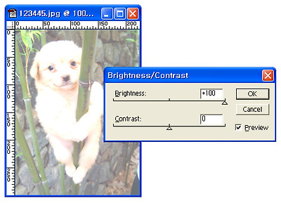 레이어 팔레트에서 복사본을 클릭한 후 'Image'(이미지)메뉴의 > 'Adjustments'(보정)메뉴 > Brightness / Contrast (명도/대비)를 선택해 Brightness(명도) 값을 최대로 올립니다.