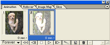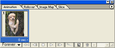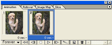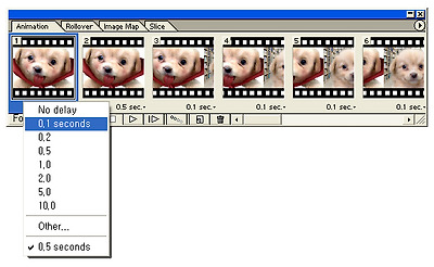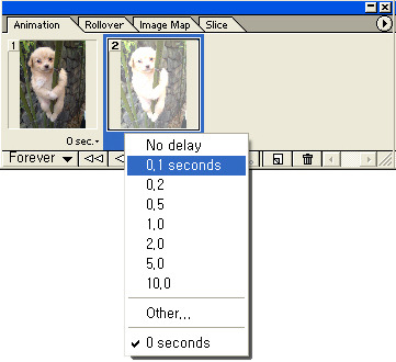 애니메이션 팔레트의' '0 sec' 옆에있는 조그마한 화살표를 눌러 앞의 이미지는 0.1초의 시간을 설정합니다.