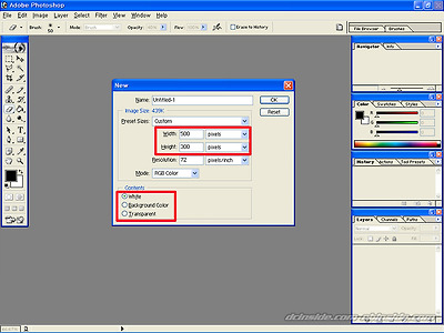 1. File > New을 선택해 새 파일을 만듭니다. 예제에서는 가로 500픽셀 세로 300픽셀로 정했으며, Contents부분에 White를 선택해 하얀이미지로 만듭니다.
