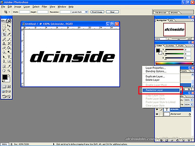 3. 레이어 팔래트에 생성된 텍스트 레이어에서 마우스 오른쪽 버튼을 눌러 Rasterize Layer를 클릭합니다. Rasterize Layer가 적용되면 투명한 레이어에 글자가 합쳐진 상태로 변환됩니다.