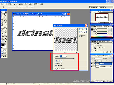 6. 설정값을 Amount 400 으로 설정하고 Distrbution에 Gaussian으로 선택하며, Monochromatic을 체크합니다.