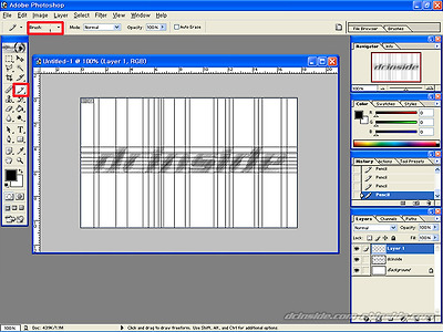 11. 좌측 툴박스 중간부분에 Pencil Tool을 이용해 가이드 라인선에 맞춰 Shift키를 누른 상태에서 그어줍니다. 여기서 브러쉬 크기는 1px로 맞춰줍니다. 가이드라인선에 맞춰 다 긋고난후 View > Show > Guides ( 단축키 Ctrl + ; )를 선택해 가이드라인선을 안보이게 합니다.