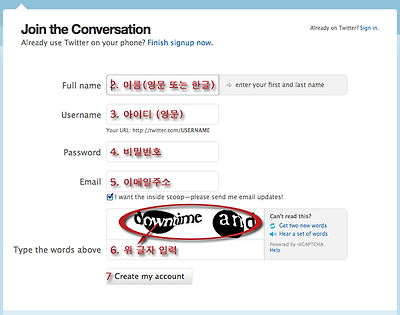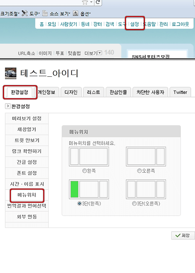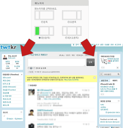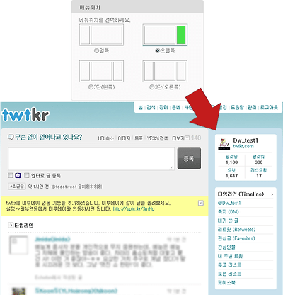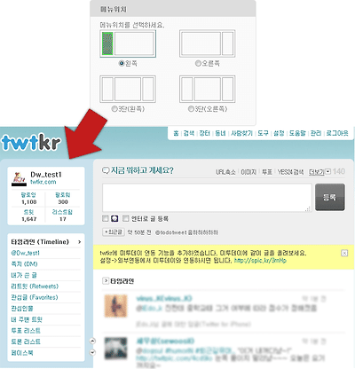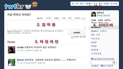 로그인하고 난 다음 twtkr.com 페이지의 오른쪽 위를 보면 메뉴가 여러 개 있습니다.