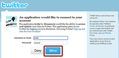 트위터가 기본으로 제공하는 인증절차를 거쳐서 twtkr에 로그인하는 방식입니다. “트위터에서 로그인” 버튼을 누르면 아래와 같은 창이 뜹니다. 이 때, 트위터에 로그인하지 않은 상태라면 트위터 로그인 화면이 나타나는데 로그인 정보를 입력하고 아래 “Allow” 버튼을 누릅니다. 마찬가지로 오른쪽 아래 “자동로그인”을 선택하면 로그아웃하지 전까지 로그인 상태가 유지됩니다.