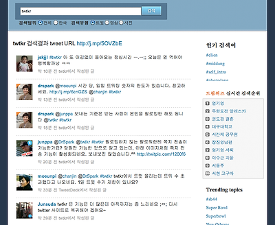 - 인기 검색어: 현재 twtkr을 사용하는 사람들이 가장 많이 검색해보는 단어와 해쉬태그 등의 목록입니다.