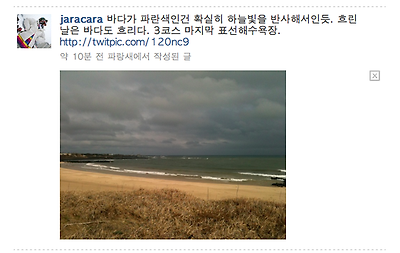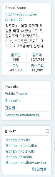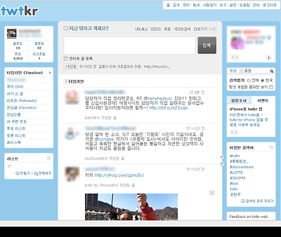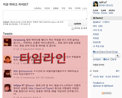 자신이 트위터에 올린 글만 모아놓은 곳입니다. 사이드바 맨위에 있는 자신의 이름/아이디를 클릭하거나 주소창에 “http://twtkr.com/아이디”를 넣고 들어가면 이 화면이 나타납니다.