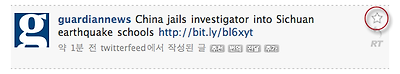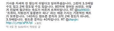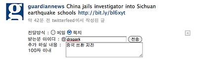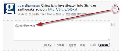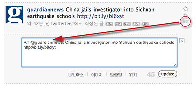리트윗 버튼을 누르면 해당 트윗이 자동 복사되어 “RT @chanjin: 글” 형식으로 입력창에 나타납니다.