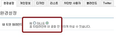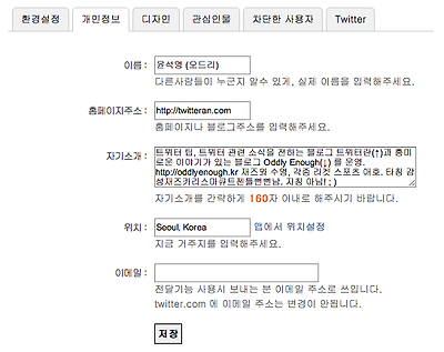 twtkr의 사용환경 설정, 개인정보 관리, 디자인 등을 설정합니다.