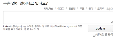 입력창에 글을 적은 다음 마우스로 “update” 버튼을 누르지 않고 키보드에 있는 엔터 키를 누르는 것만으로 트위터에 글을 올릴 수 있습니다.