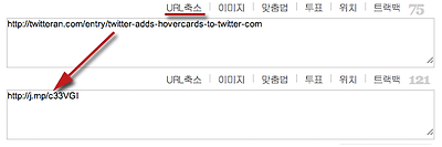 입력창에 글을 쓰기 전이나 도중, 후에 트위터에 알리고 싶은 웹사이트의 웹주소를 입력창에 적고 이 버튼을 누르면 웹주소(URL)가 짧게 변환됩니다.