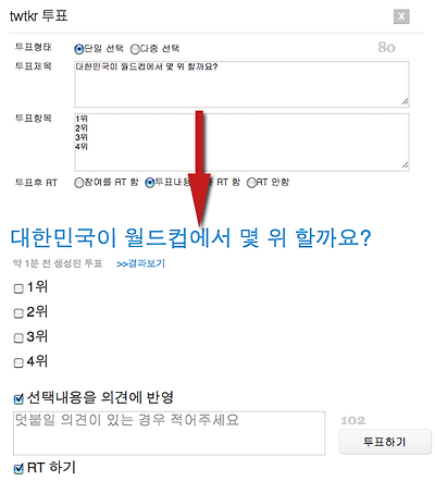 - 투표 참여자가 투표를 하기 전에 현재까지 투표결과를 보고 싶다면, 제목 아래 “결과보기”를 클릭합니다. 참여자도 마찬가지로 투표를 마친 뒤 follower들에게 자신이 어떤 선택을 했는지 알리려면 “선택내용을 의견에 반영”을 선택하고, 남들에게 알리지 않고 투표만 하고싶다면 “선택내용을 의견에 반영”, “RT 하기” 모두 선택하지 않습니다.